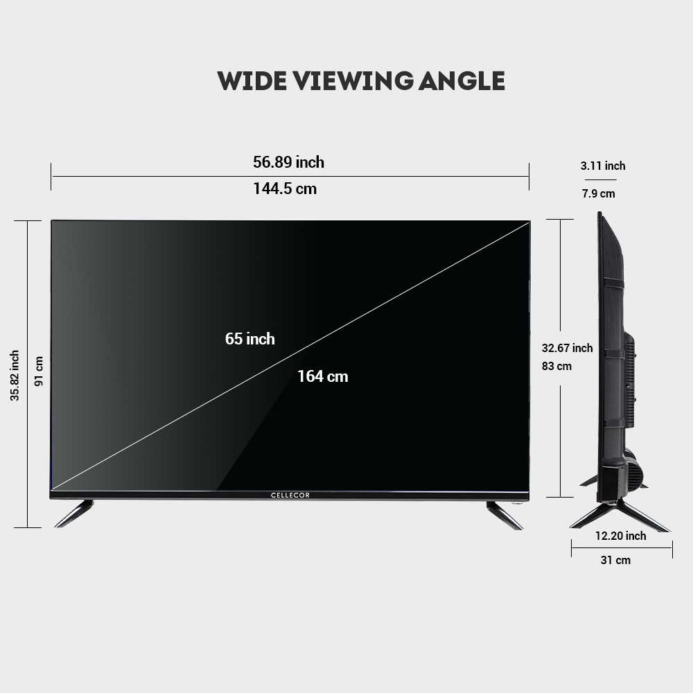 CELLECOR S-65 ( 65 inch ) UHD 4K LED Smart TV, Watch Your Favourite Movies and Show on a Big screen at home which gives you a theater-like experience. Sounds comes with Dolby Atmos Audio with 20W speakers.