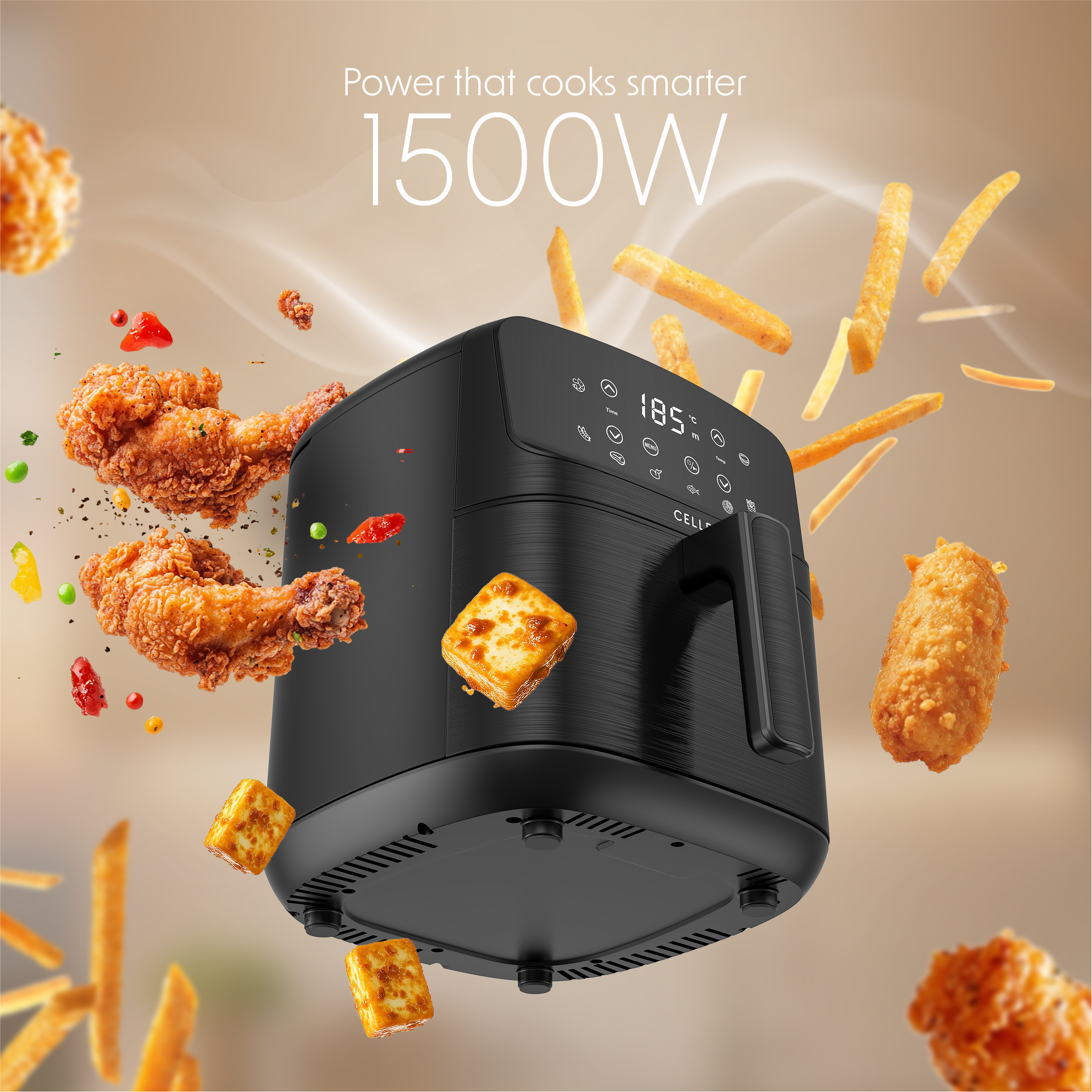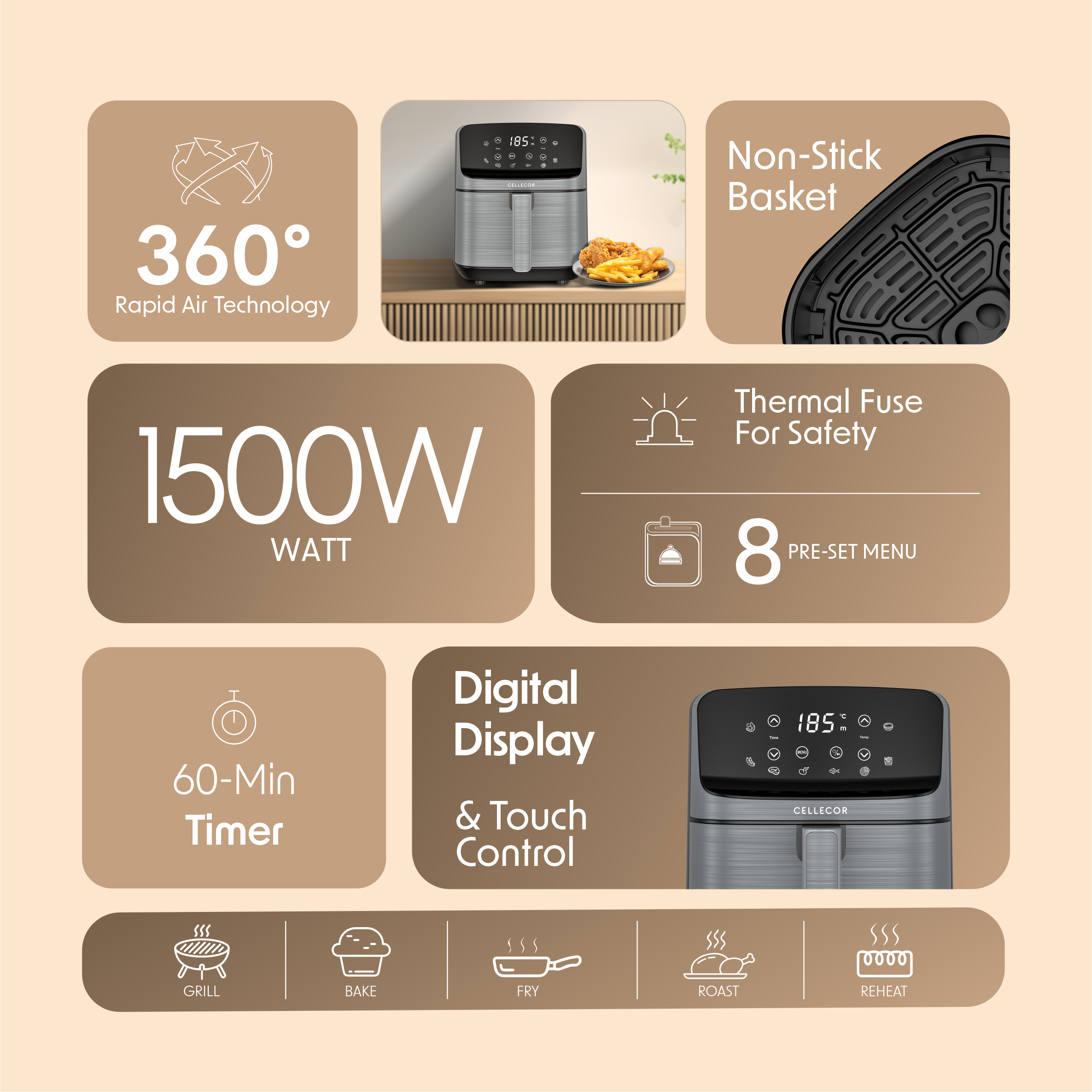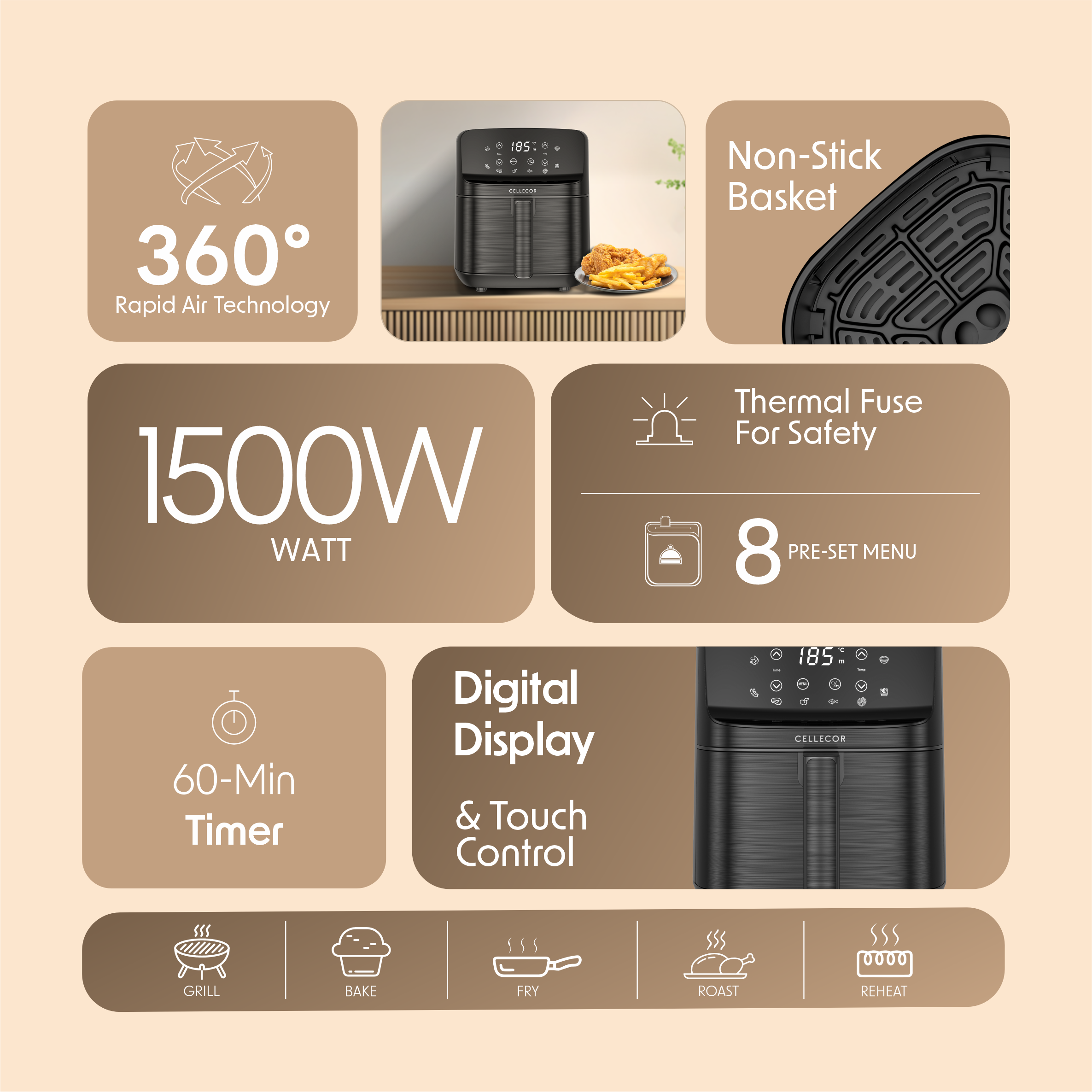 1500W Powerful Output : The Cellecor Aurifry Air Fryer comes with a 1500W powerful motor, delivering quick and efficient cooking so you can fry, bake, grill, or roast your favourite meals in minutes.