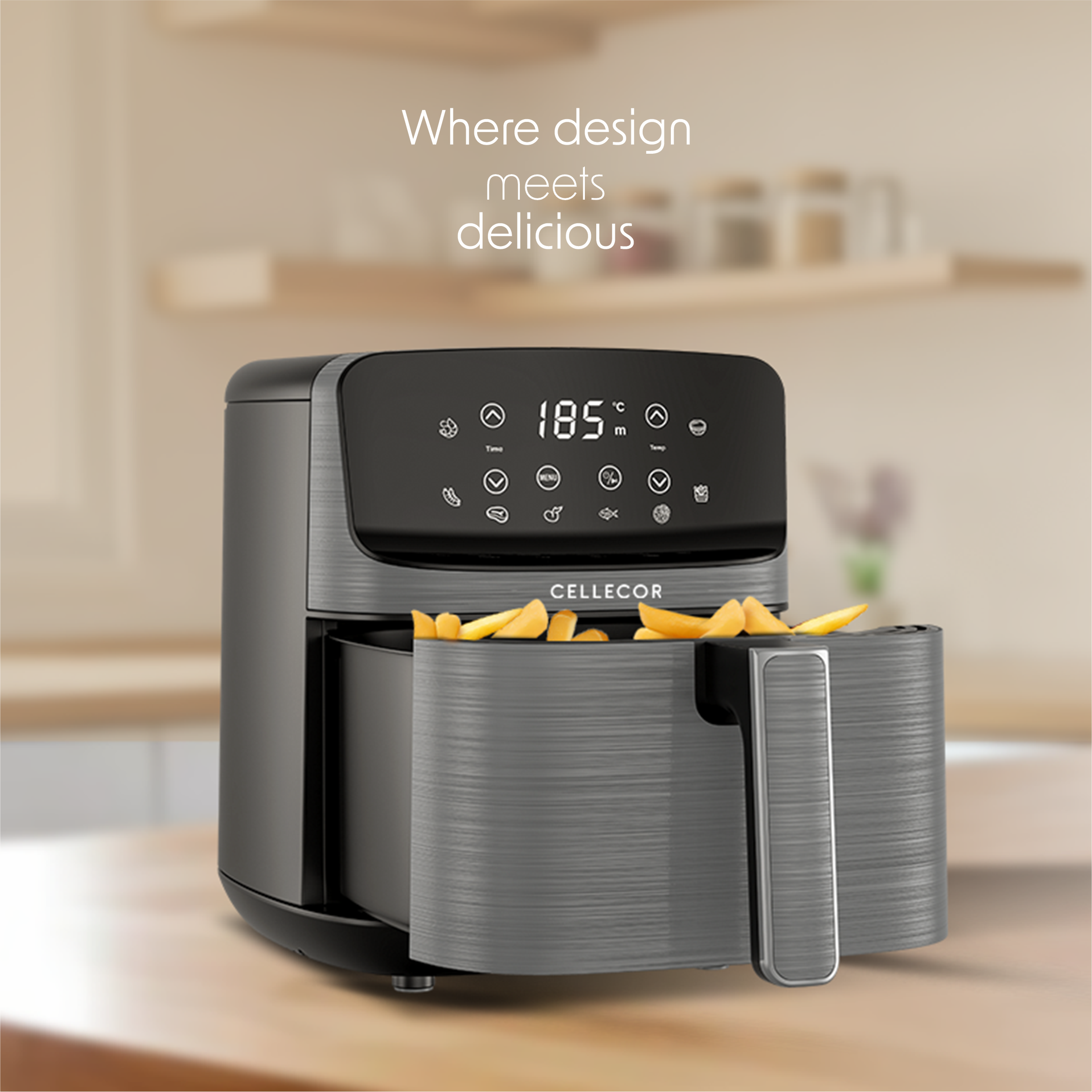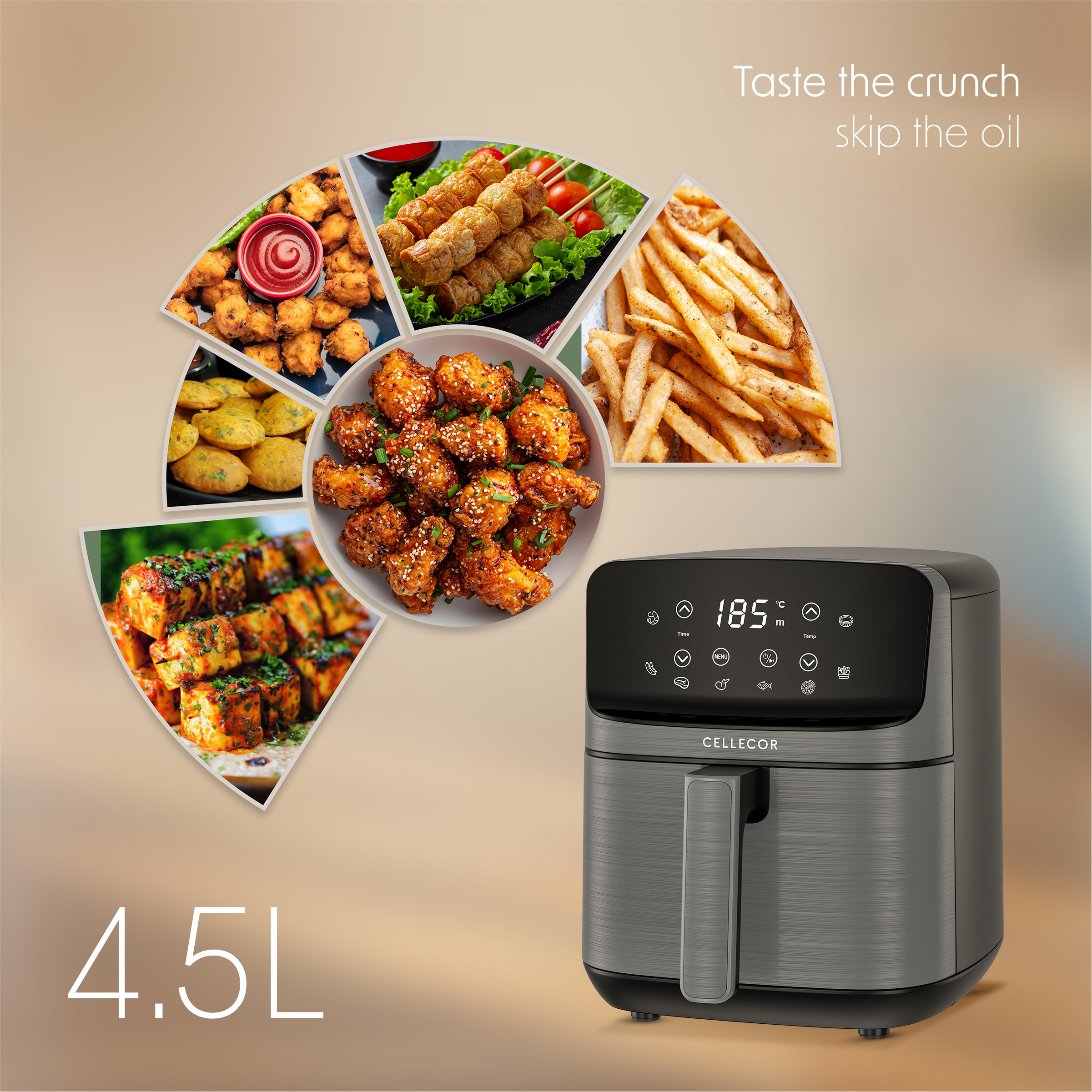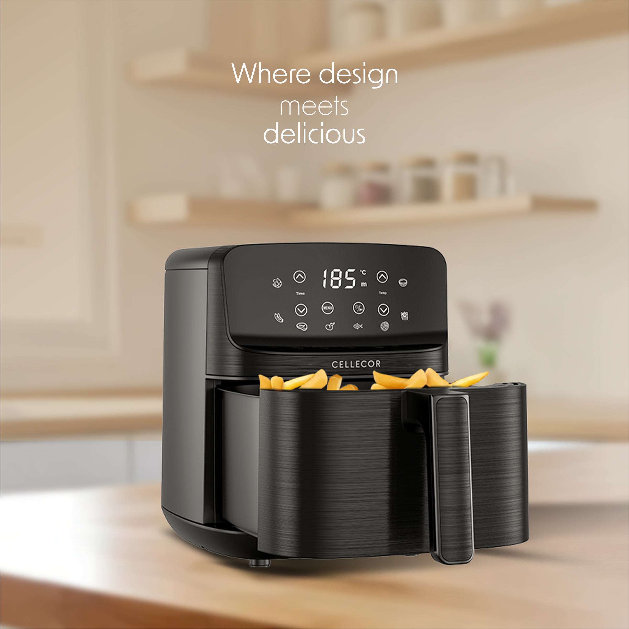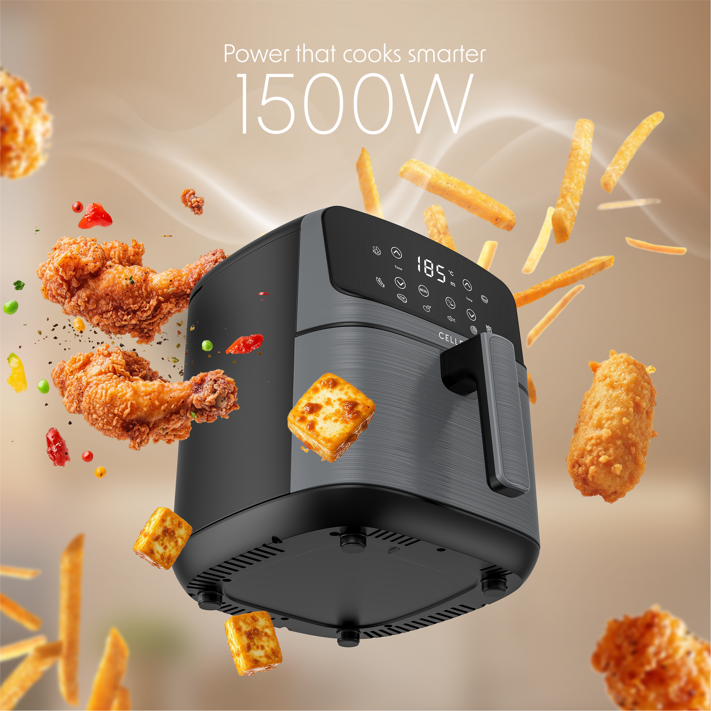 1500W Powerful Output : The Cellecor Aurifry Air Fryer comes with a 1500W powerful motor, delivering quick and efficient cooking so you can fry, bake, grill, or roast your favourite meals in minutes.