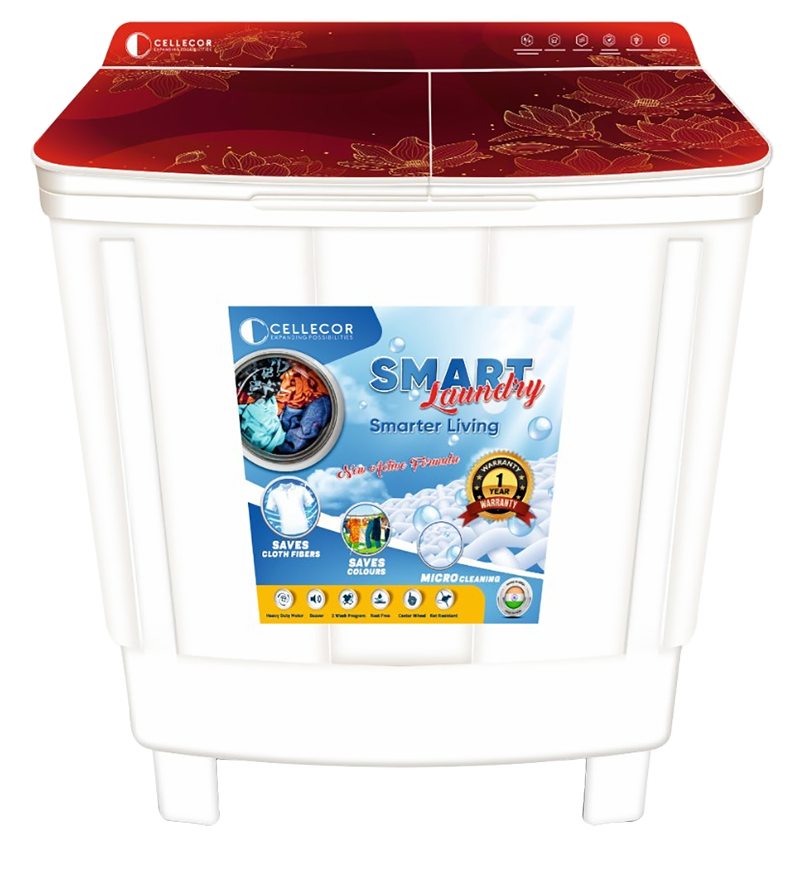 Cellecor C75 Semi Automatic Washing Machine with Anti Rust Body, 35 Min Soak Function, Collar Scrubber, Glass Lid, Lint Filter, 2 Wash Programs, Buzzer, and Large Capacity Tub