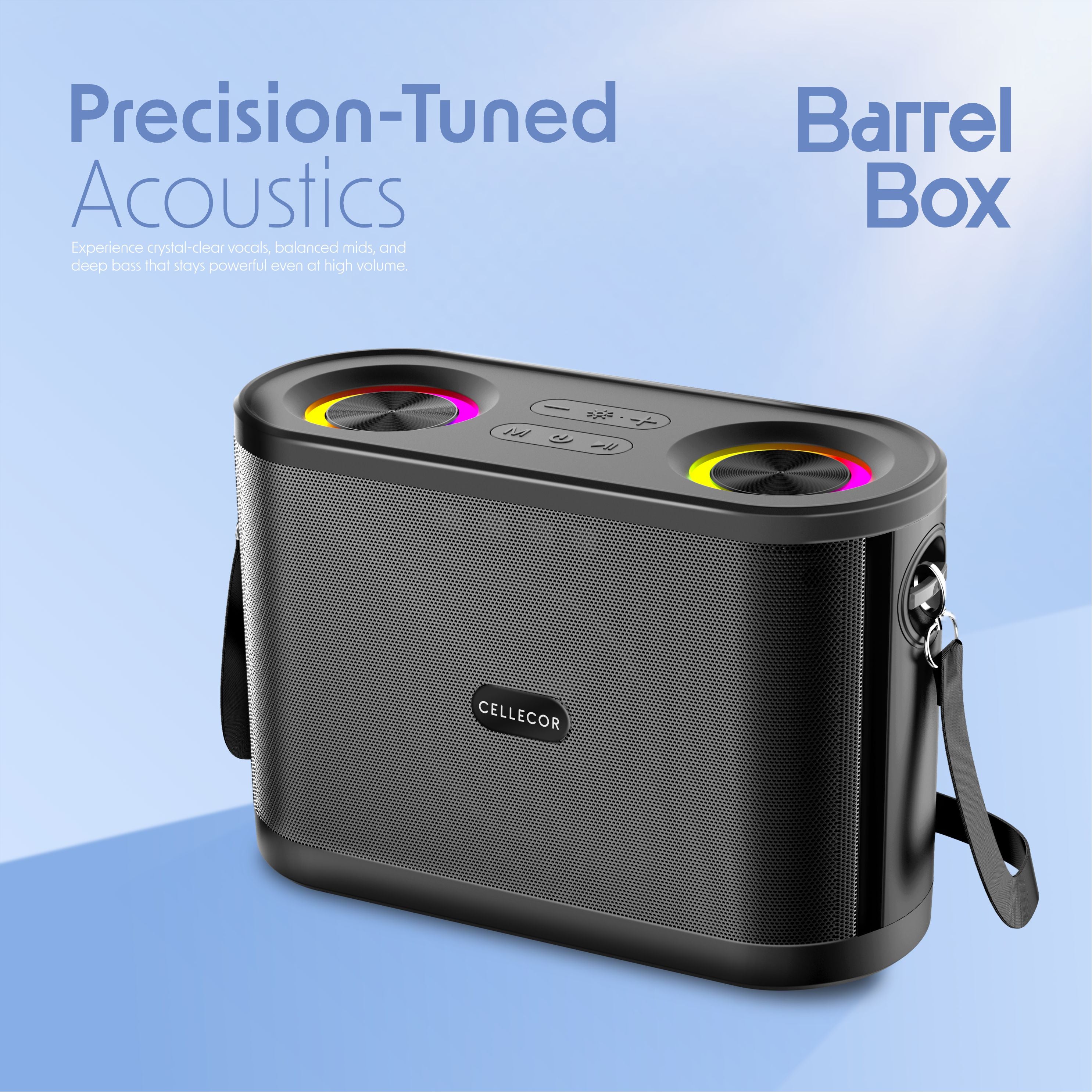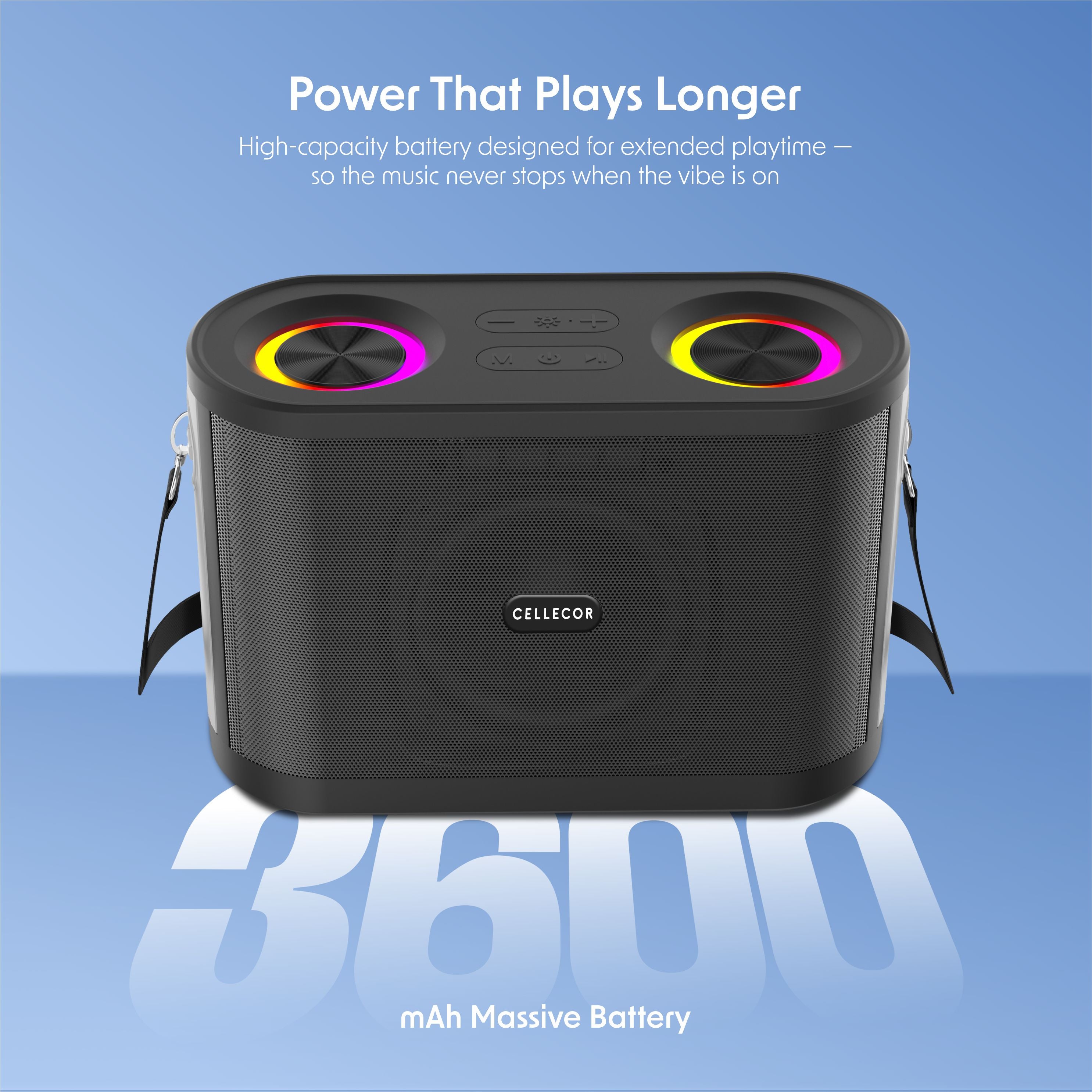 Textured Strap for Easy Carrying : Cellecor Portable speaker comes with a sturdy, textured strap designed for a comfortable and secure grip, making your speaker easy to carry anywhere.