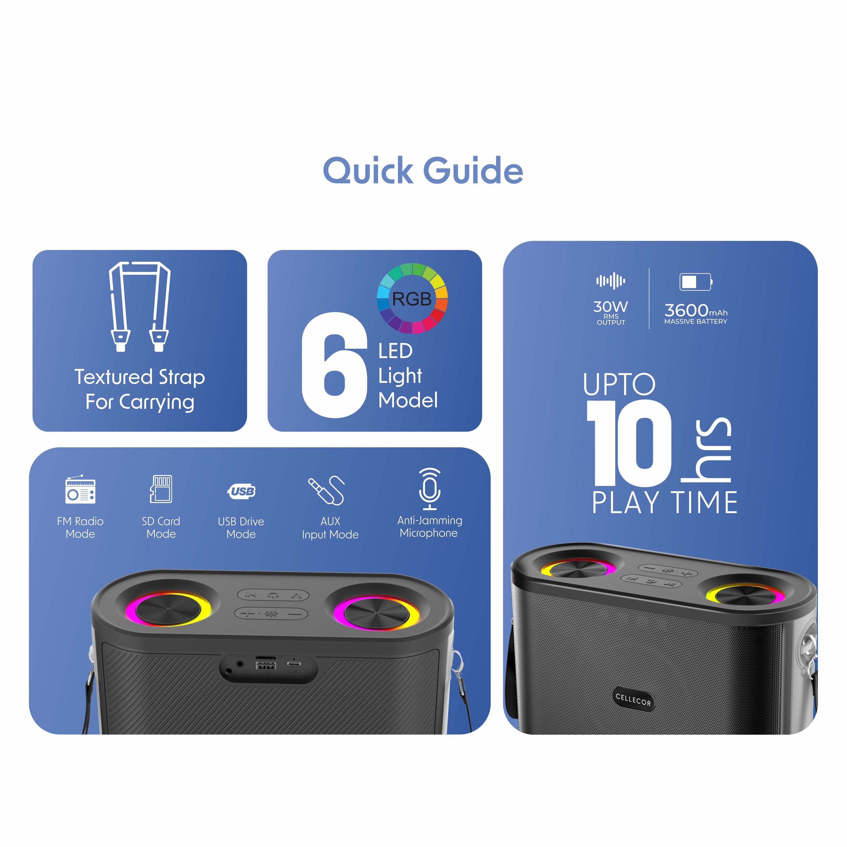 30W RMS Output : Delivers clear, powerful sound with deep bass, ideal for both indoor and outdoor use.