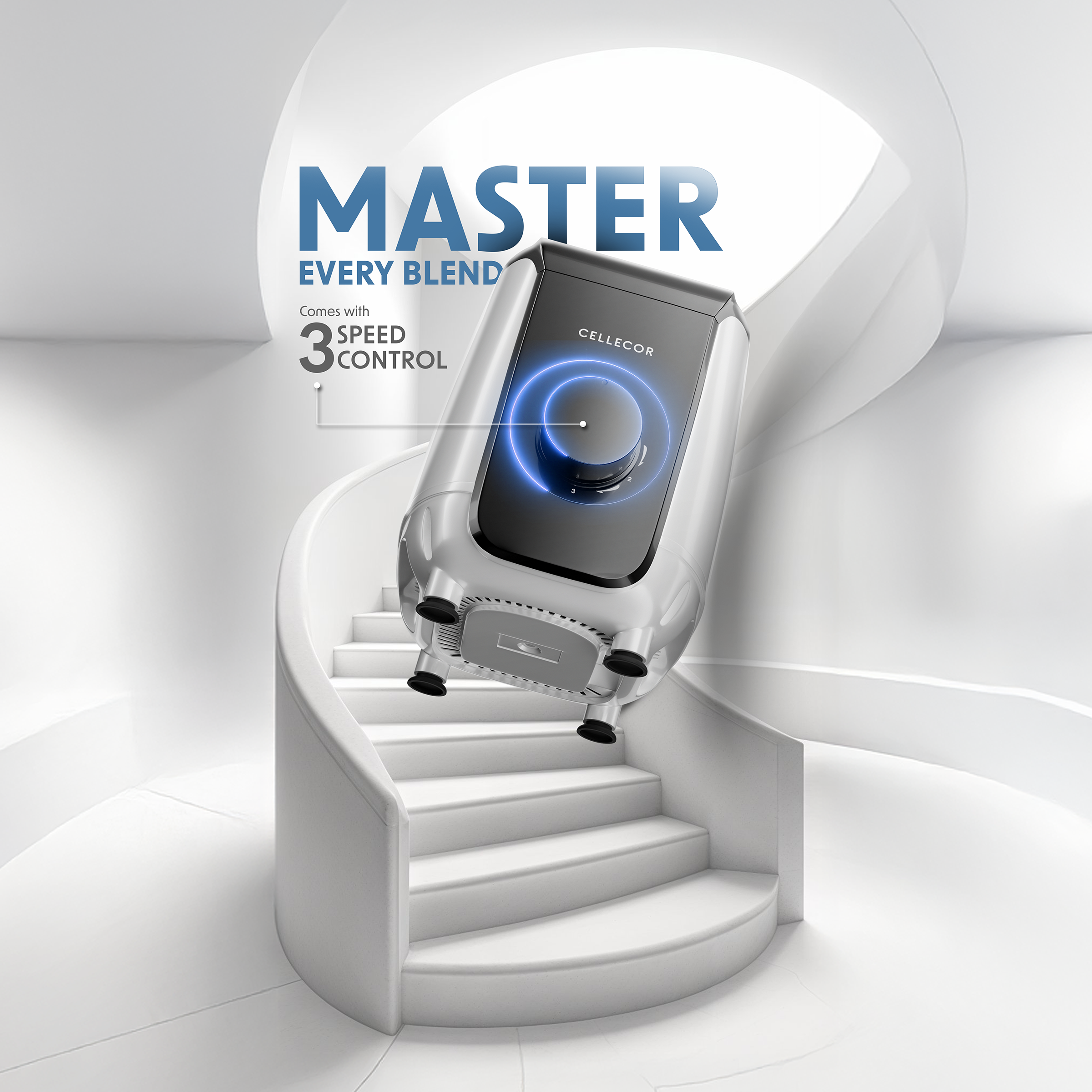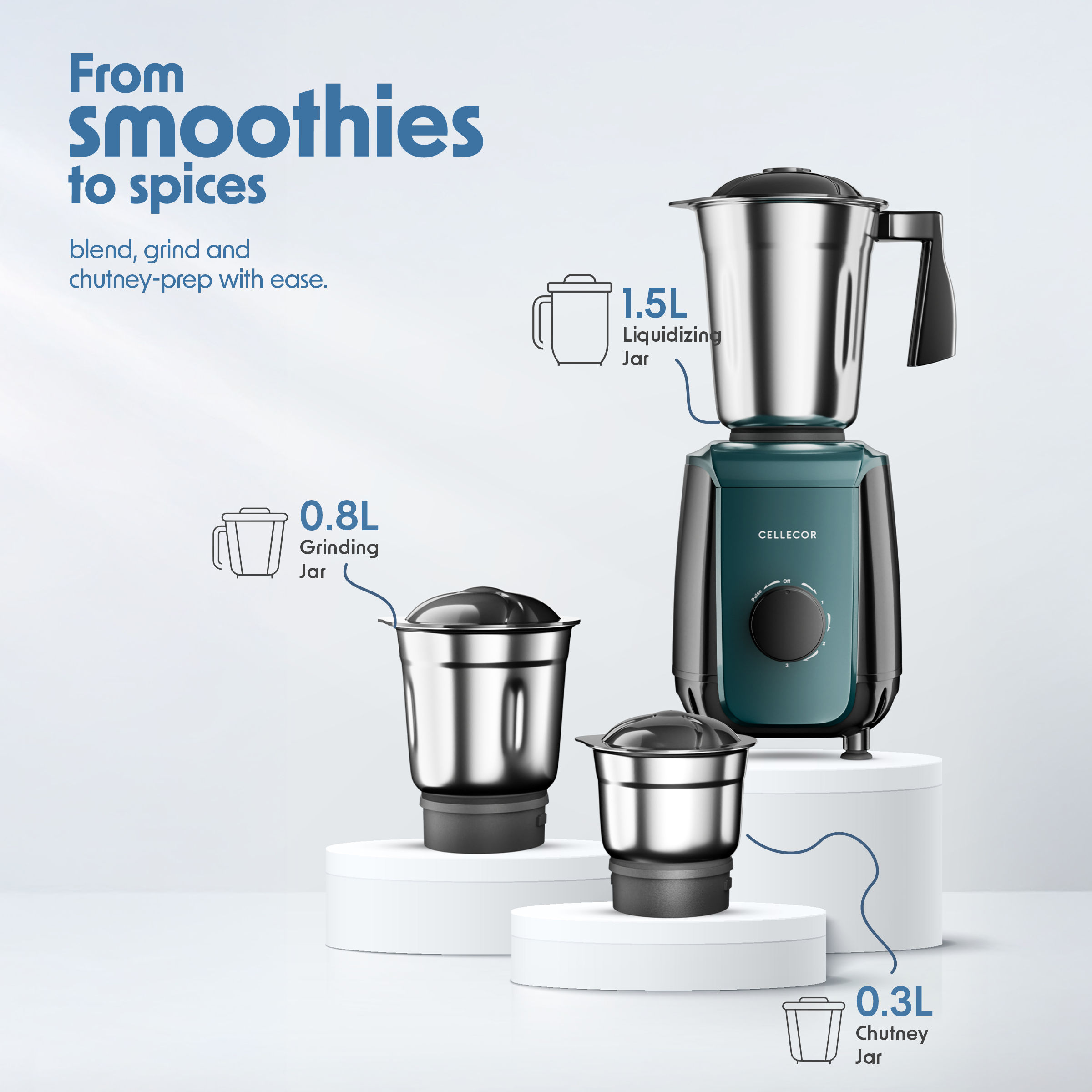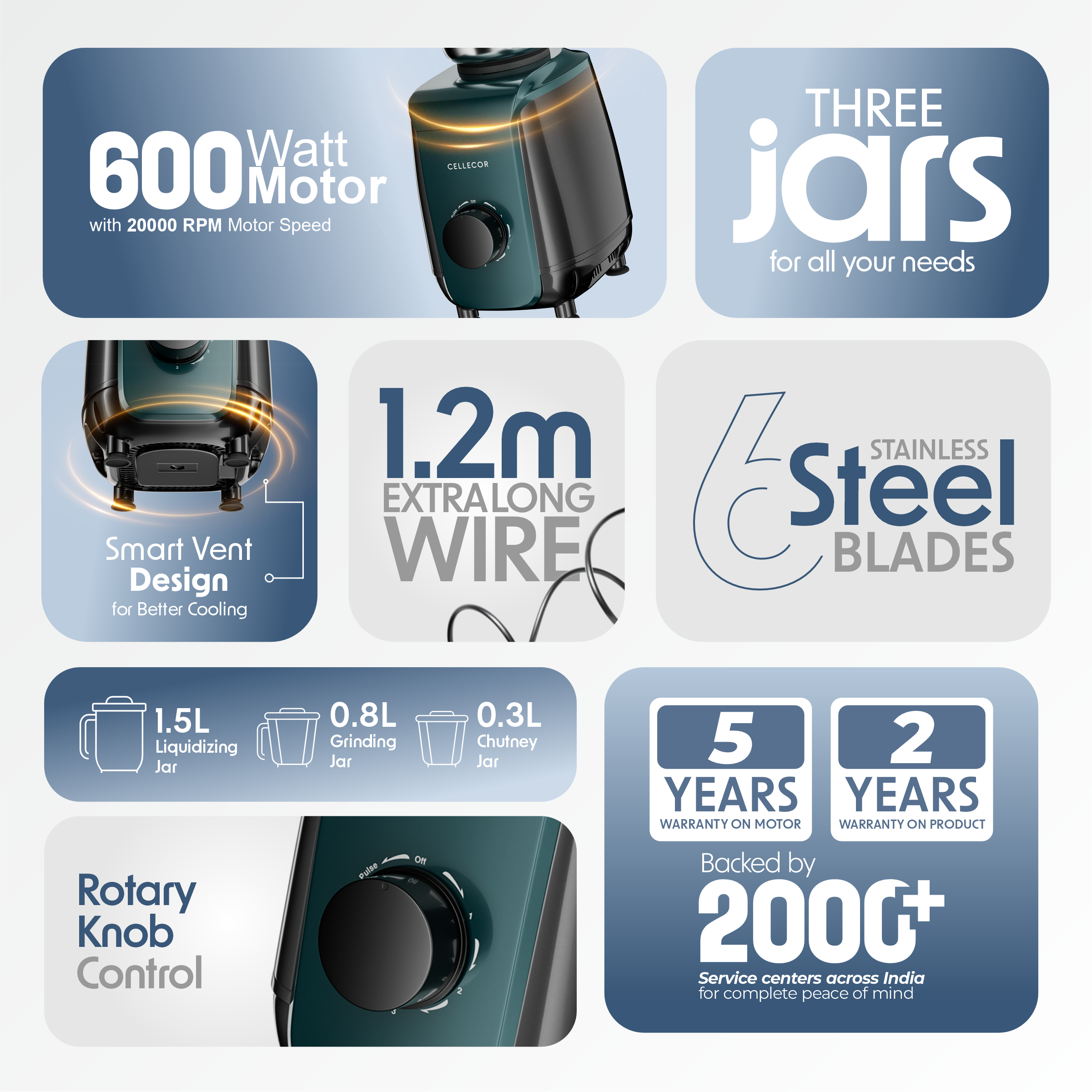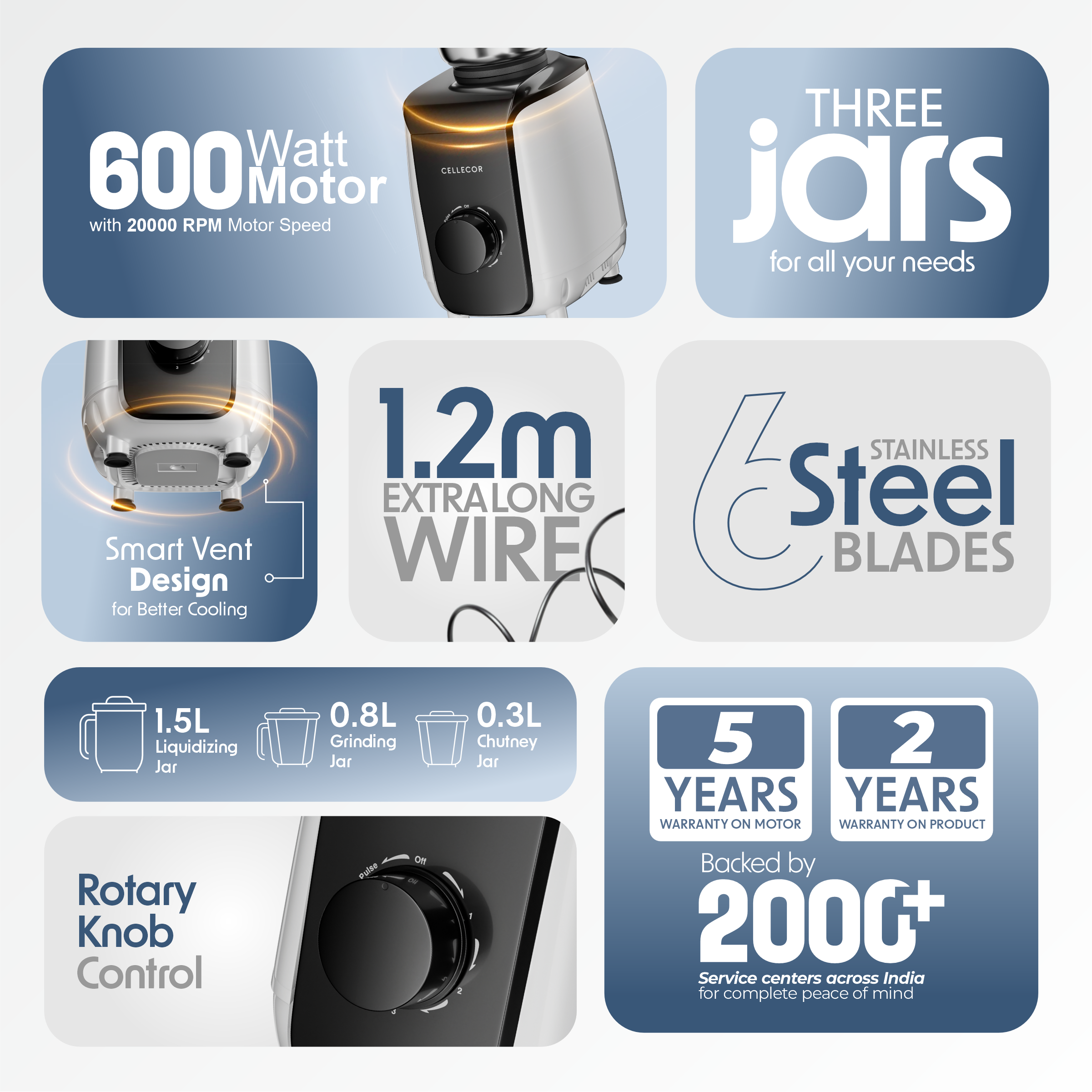 The Cellecor CMG60WH Mixer Grinder features a powerful 600W motor with durable stainless steel jars and blades. Equipped with three speed control, pulse function, and overload protection, it ensures smooth grinding, efficient blending, safe operation, and reliable everyday performance in a compact, modern kitchen design.