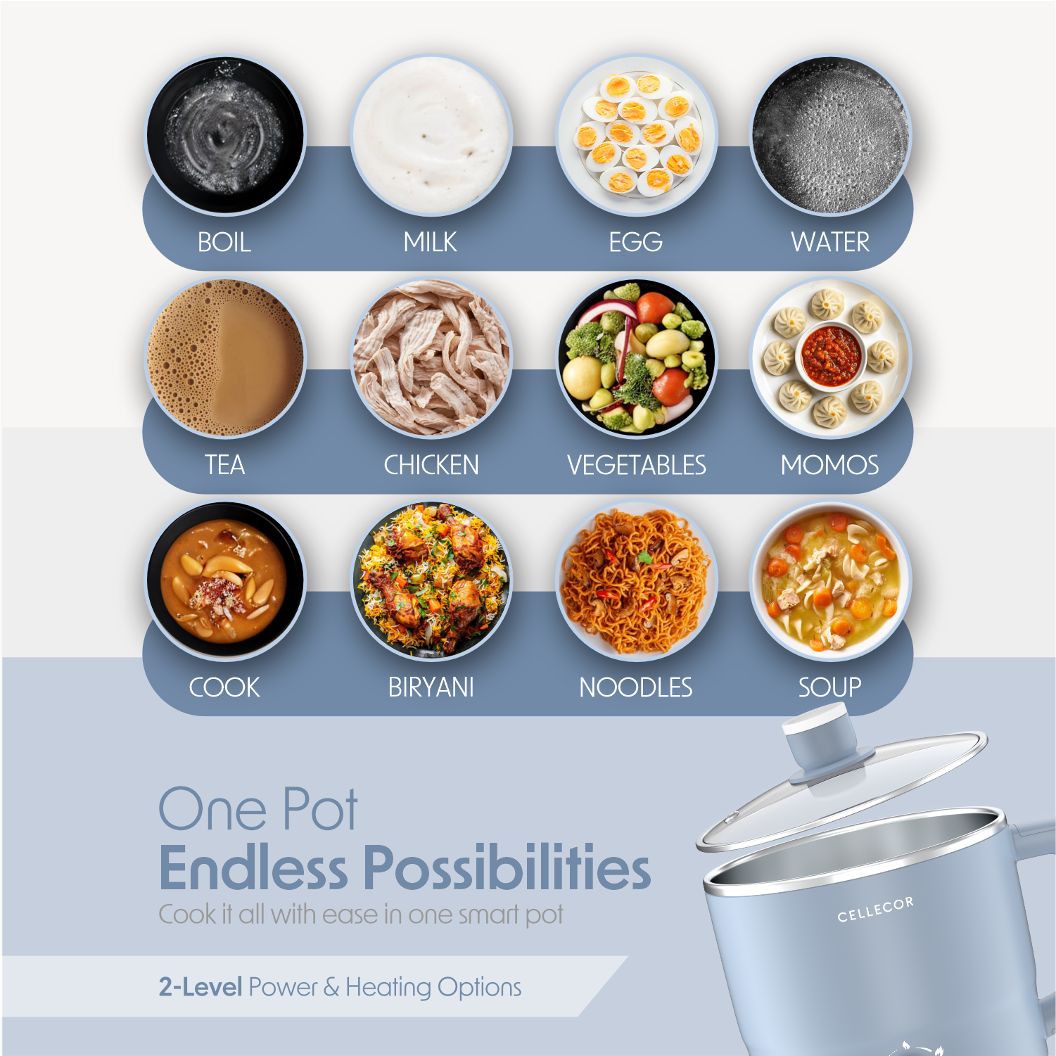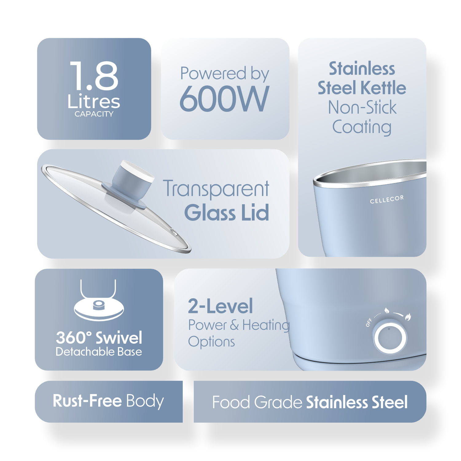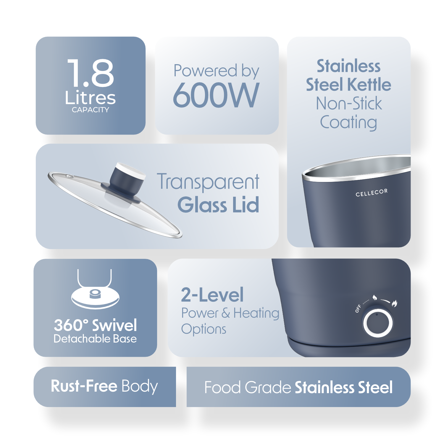The Cellecor Home Chef Multi-Cook Kettle is designed for convenience and durability with a transparent glass lid to monitor meals, a 360° swivel detachable base for easy handling, and a 600W powerful output for quick cooking. Its versatile cooking options let you boil, steam, or reheat with ease, while the rust-free body ensures long-lasting performance. Backed by a 2-year warranty, this affordable, compact, and easy-to-clean kettle is the perfect all-in-one partner for your everyday kitchen needs.