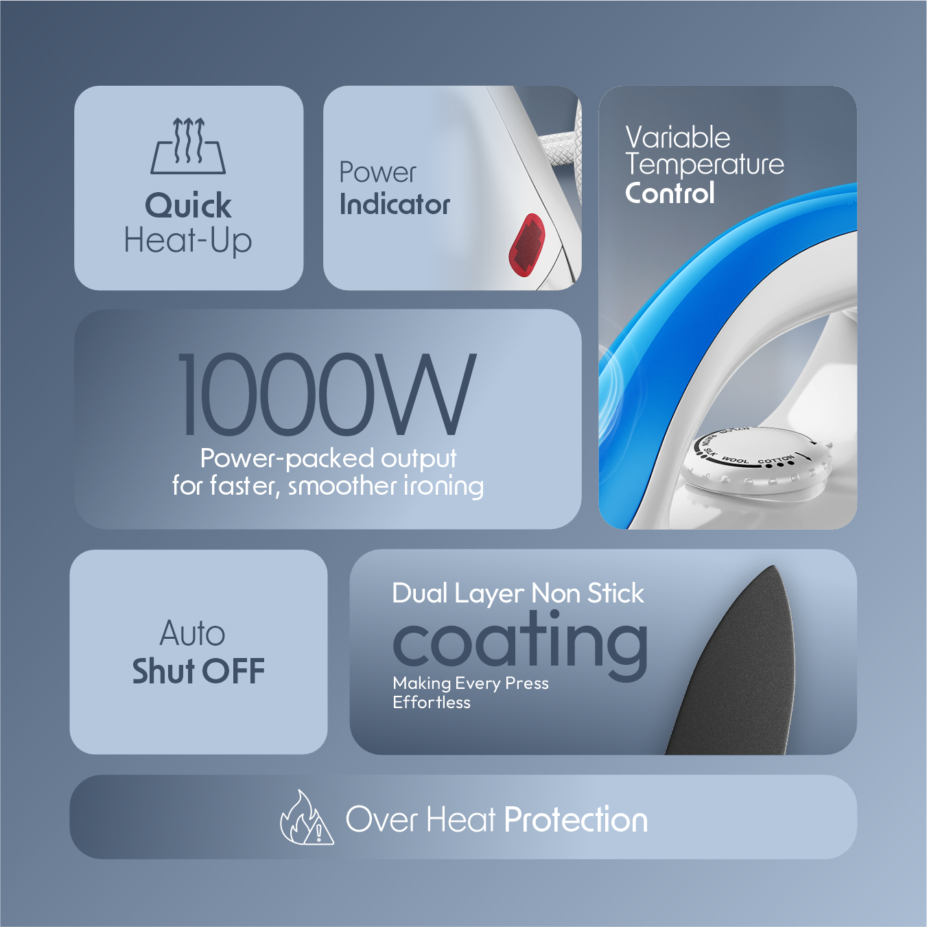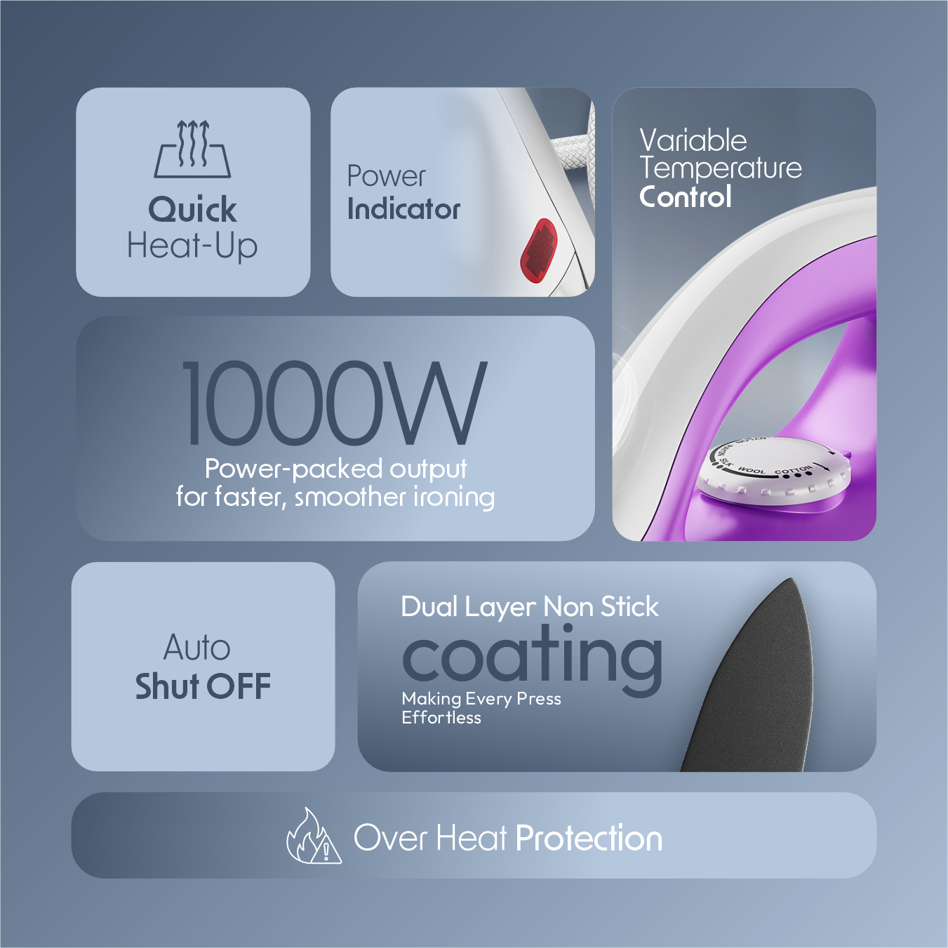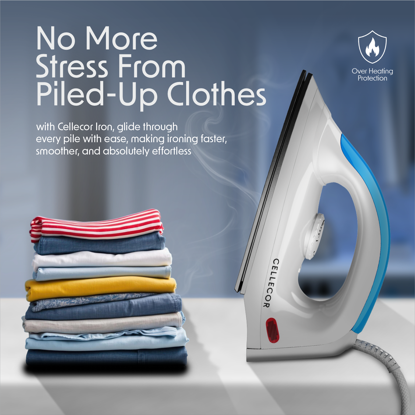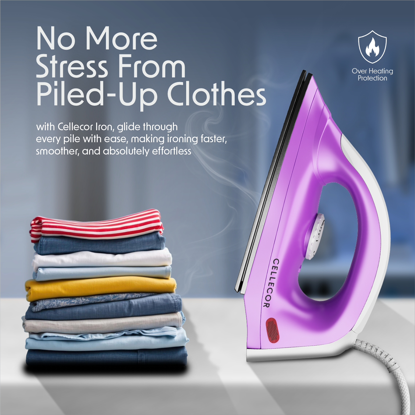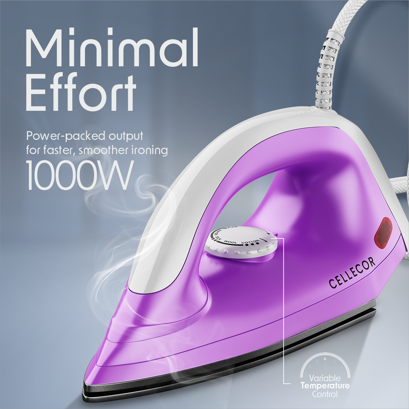 1000W Heating Power: The Cellecor Electric Dry Iron is powered by a strong 1000-watt heating element that ensures quick and uniform heating.