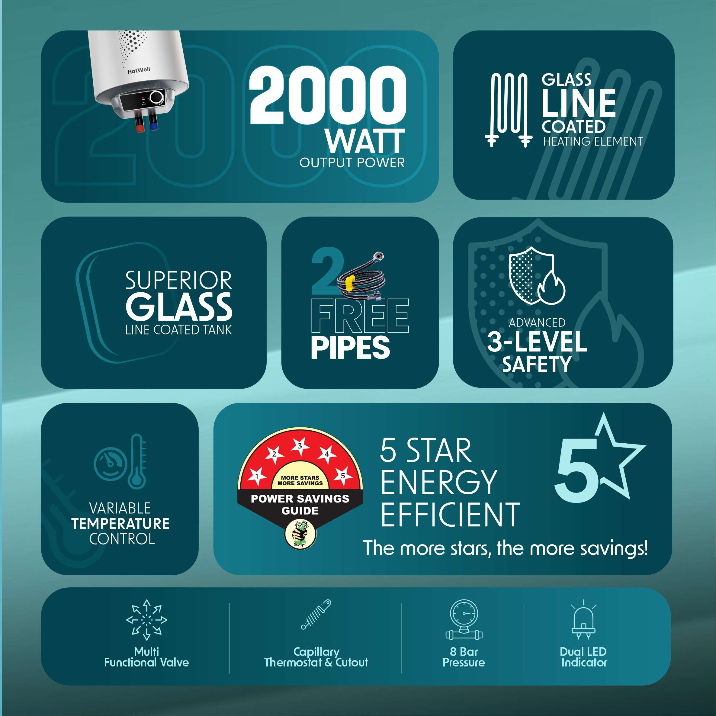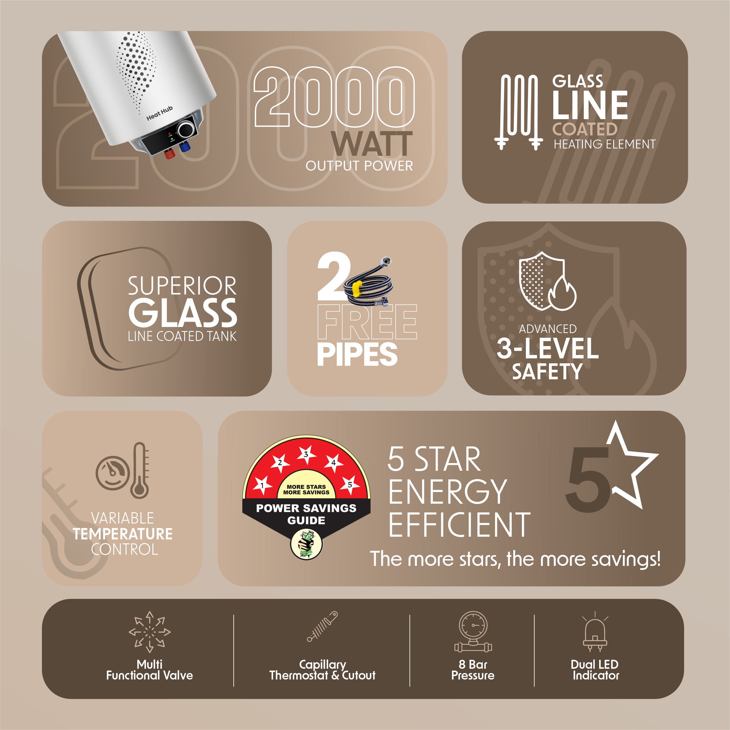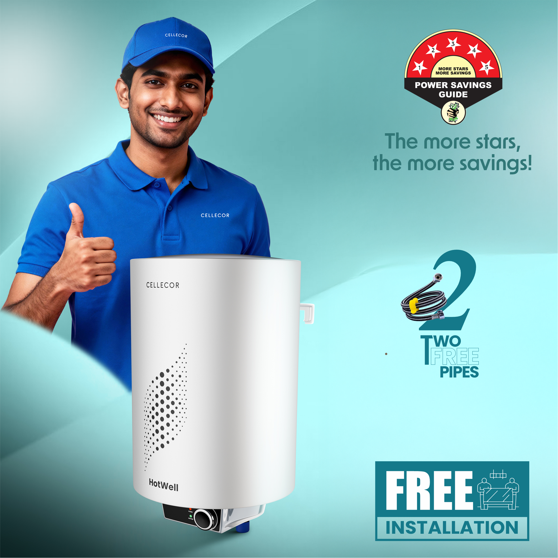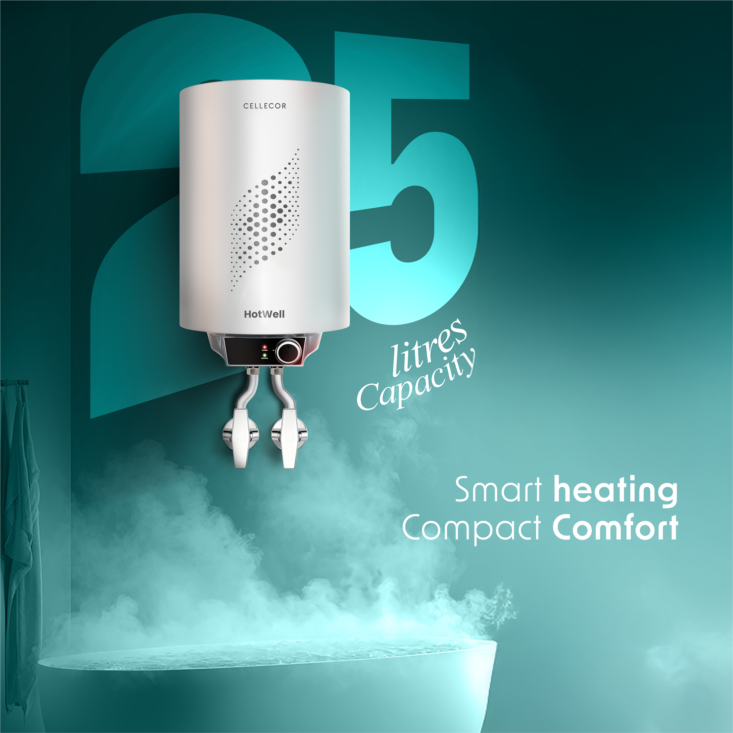 Multiple Capacity Options : Available in 10L, 15L & 25L, Cellecor geysers offer 2000W fast heating, instant-style performance, a durable glass-lined anti-rust tank, and 8-bar pressure support for every home and bathroom.