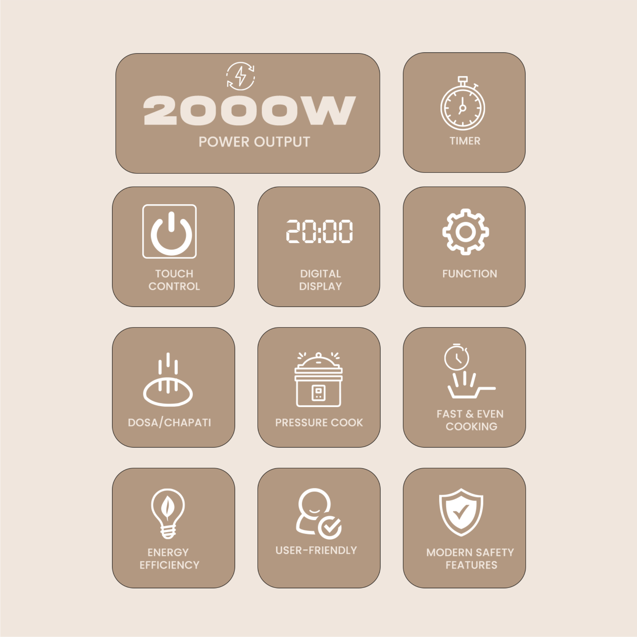 The Cellecor 2000 Watts Induction Cooktop offers high performance with its efficient 2000W power output, enabling faster cooking. It simplifies meal preparation with 7 preset cooking modes, including pressure cook, stir fry, deep fry, and many other modes tailored for different dishes. The cooktop features a modern feather touch panel for easy control, along with overheat protection that automatically shuts it off for safety. It is energy-efficient, using less power while maintaining effective cooking. Additional features include a digital display, touch control, auto voltage regulation, and an easy-to-clean surface for added convenience.