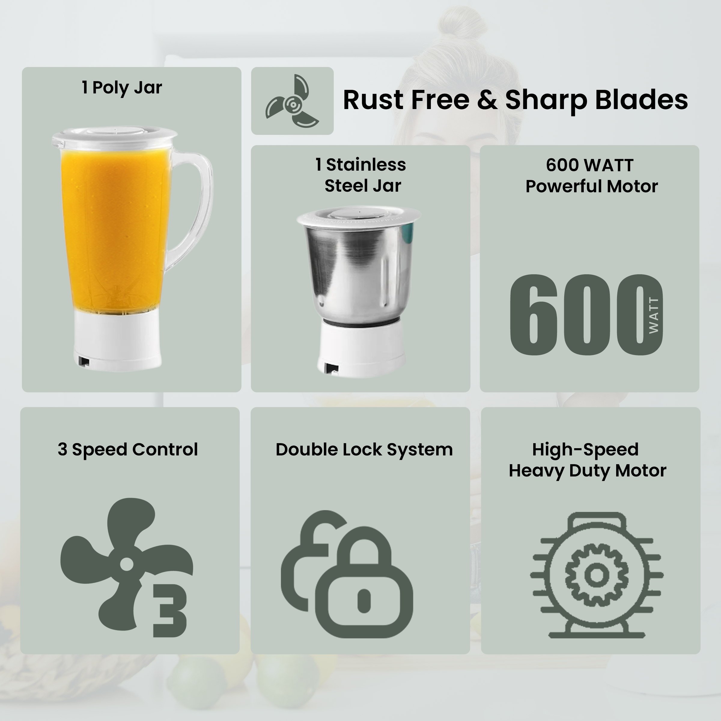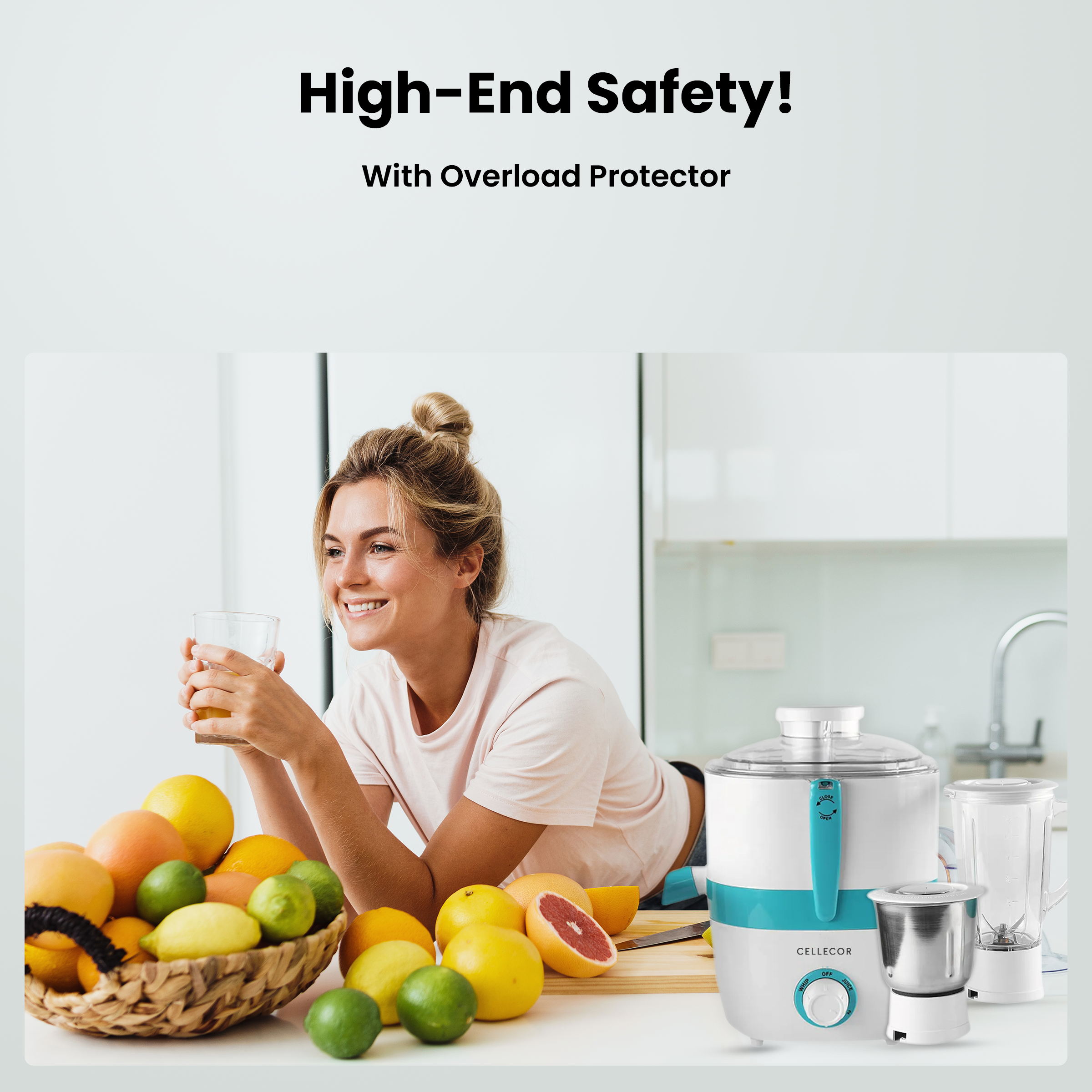 Effective and Efficient Heavy-Duty Motor: The Cellecor Juicer Mixer grinder incorporates advanced technology to achieve superior grinding outcomes. Equipped with a powerful 600-watt motor, it not only saves up to 10% of your time but also minimizes heat generation within the mixer's body.