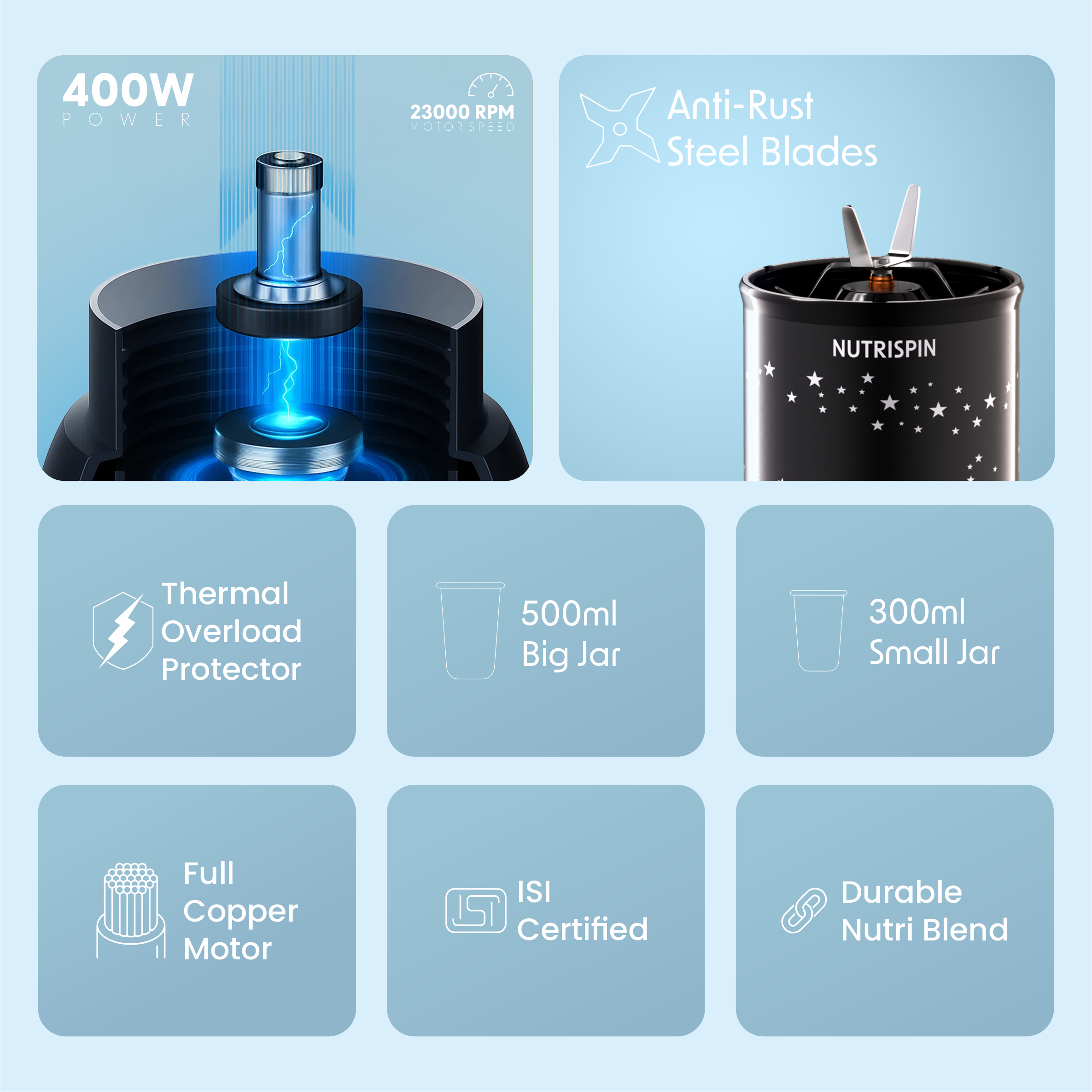 6 Leaf Blade : NutriSpin is equipped with a precision-engineered 6 Leaf blade, this blender delivers faster, more consistent blending.